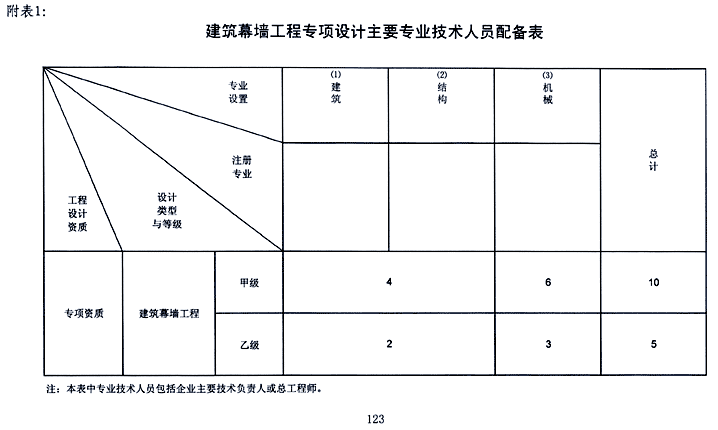 (3)在主要專業(yè)技術(shù)人員配備表規(guī)定的人員中,非注冊人員應(yīng)具有3年以上從事建筑幕墻設(shè)計經(jīng)歷,并主持過不小于1項大型或2項中型規(guī)模的建筑幕墻工程設(shè)計。